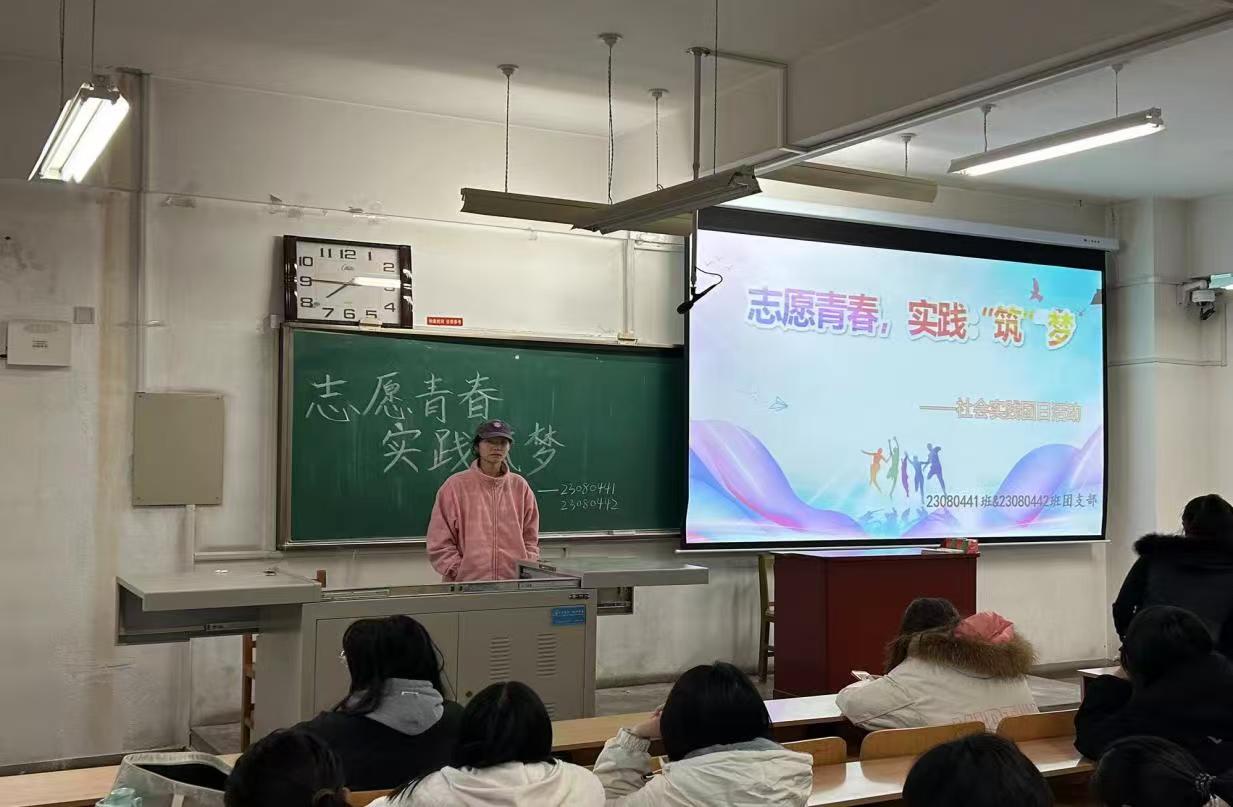 活动开始,本班团支书开展“志愿青春 实践筑梦”主题班会,为同学们介绍社会实践目的及意义,使同学们对社会实践活动有了初步认识。